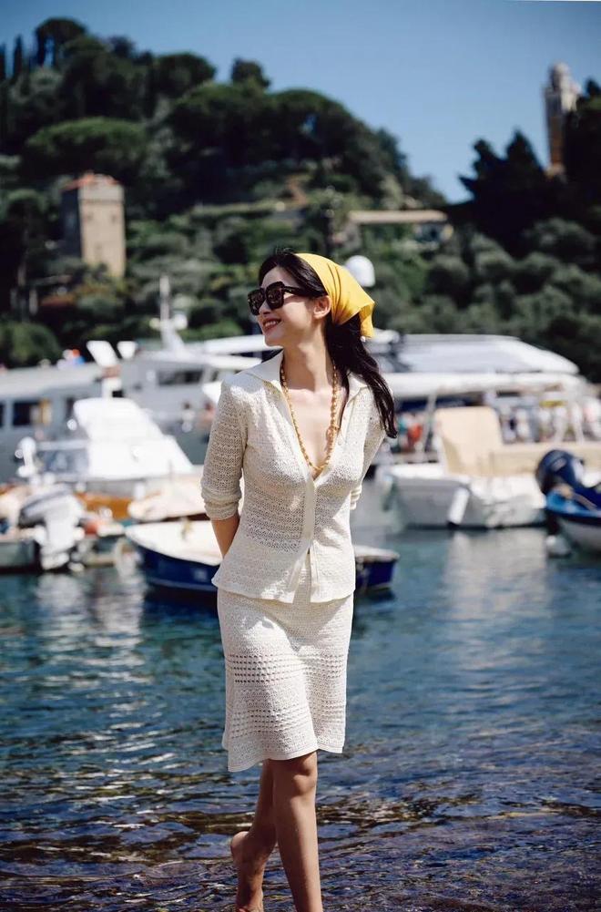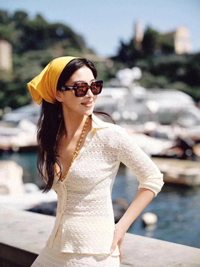 穿衣打扮不能忽略配饰的重要性,米白色的针织套装裙,离不开彩色系的配饰点缀,朱珠就选择了一条黄色头巾,系在头上还有法式复古的风味,再戴上一副墨镜,简直太美了!