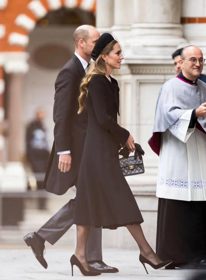 凯特王妃穿了一条收腰的黑色连衣裙,黑色丝绒高跟鞋、黑色,这身打扮很精致、也不缺少庄严和肃穆。