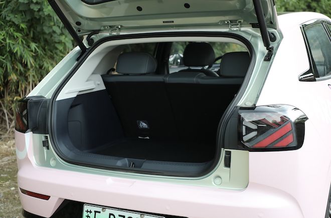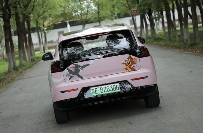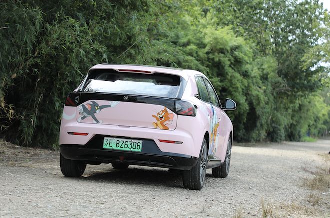 车身侧面:4337mm×1860mm×1572mm 的车身尺寸搭配 2770mm 超长轴距,营造出 “短前悬、长轴距” 的舒展比例。车顶采用轻微溜背造型,搭配 17 英寸双色旋风轮毂,运动感十足;车窗下沿的银色饰条从 A 柱延伸至车尾,提升了车身的精致度。值得一提的是,车门把手采用隐藏式设计,不仅降低风阻,还让车身侧面线条更显流畅,同时配备无钥匙进入功能,日常使用更便捷。